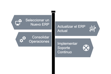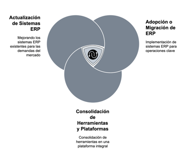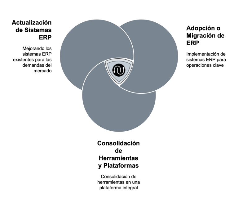 Adopción o migración de un sistema ERP: Gestiona operaciones clave en diversas funciones, facilita la transferencia de información entre departamentos, busca información del cliente y recopila inteligencia empresarial para una toma de decisiones efectiva.